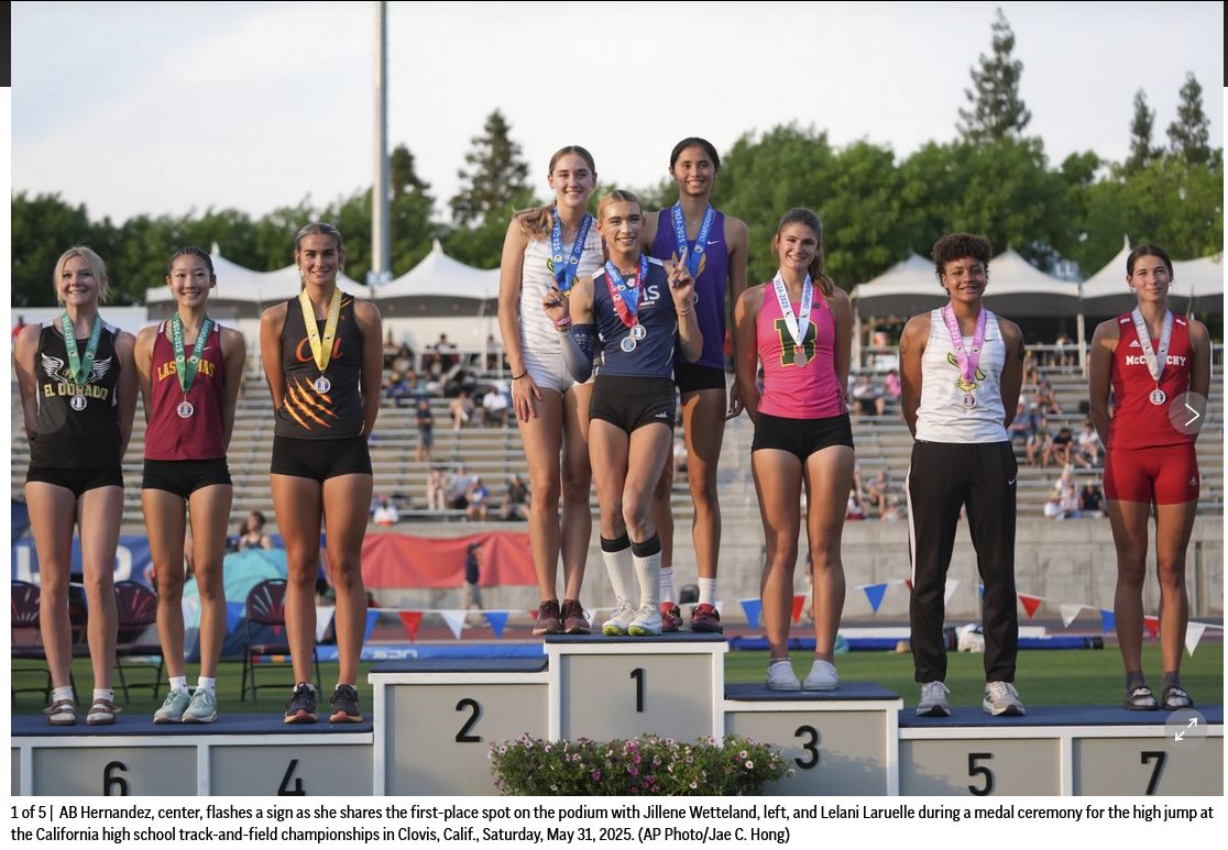 Hernandez finished the high jump with a mark of 5ft 7in (1.7 meters), the Associated Press reported, with no failed attempts. The two co-winners also cleared that height after each logged a failed attempt. The three shared the first-place win, smiling as they stepped together onto the podium.