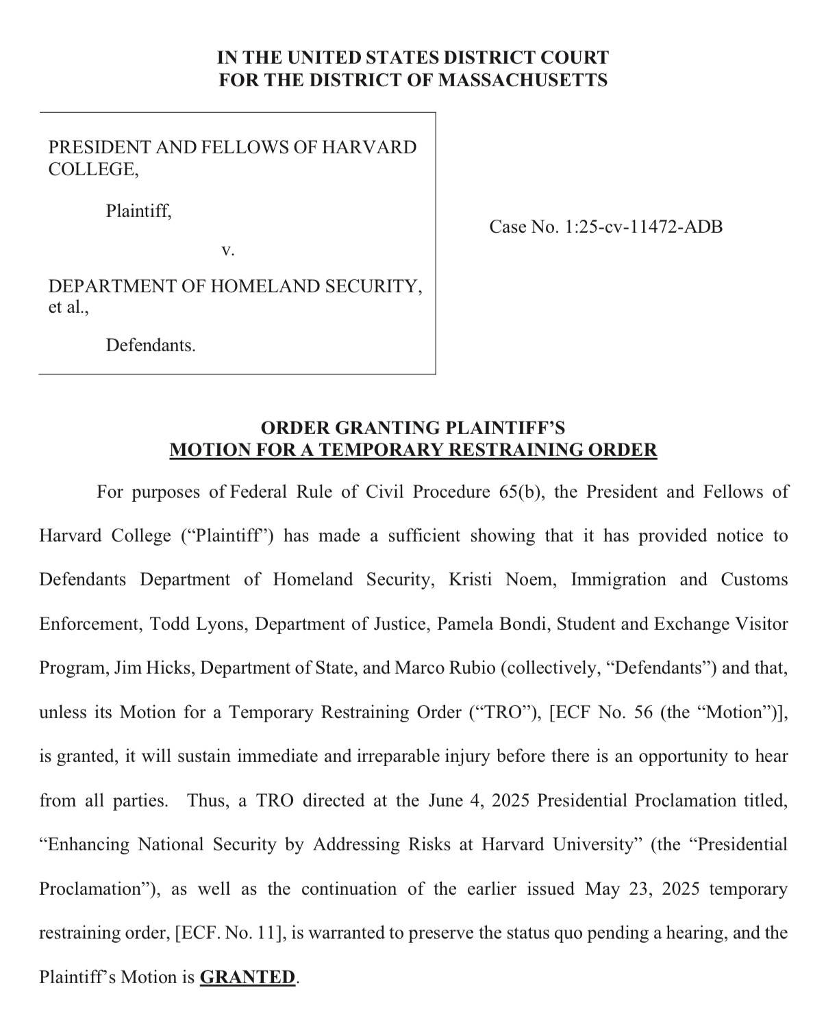 BREAKING: Judge Burroughs grants a temporary restraining order blocking Trumps effort to block foreign students from attending Harvard. https://storage.courtlistener.com/recap/gov.uscourts.mad.285083/gov.uscourts.mad.285083.59.0.pdf