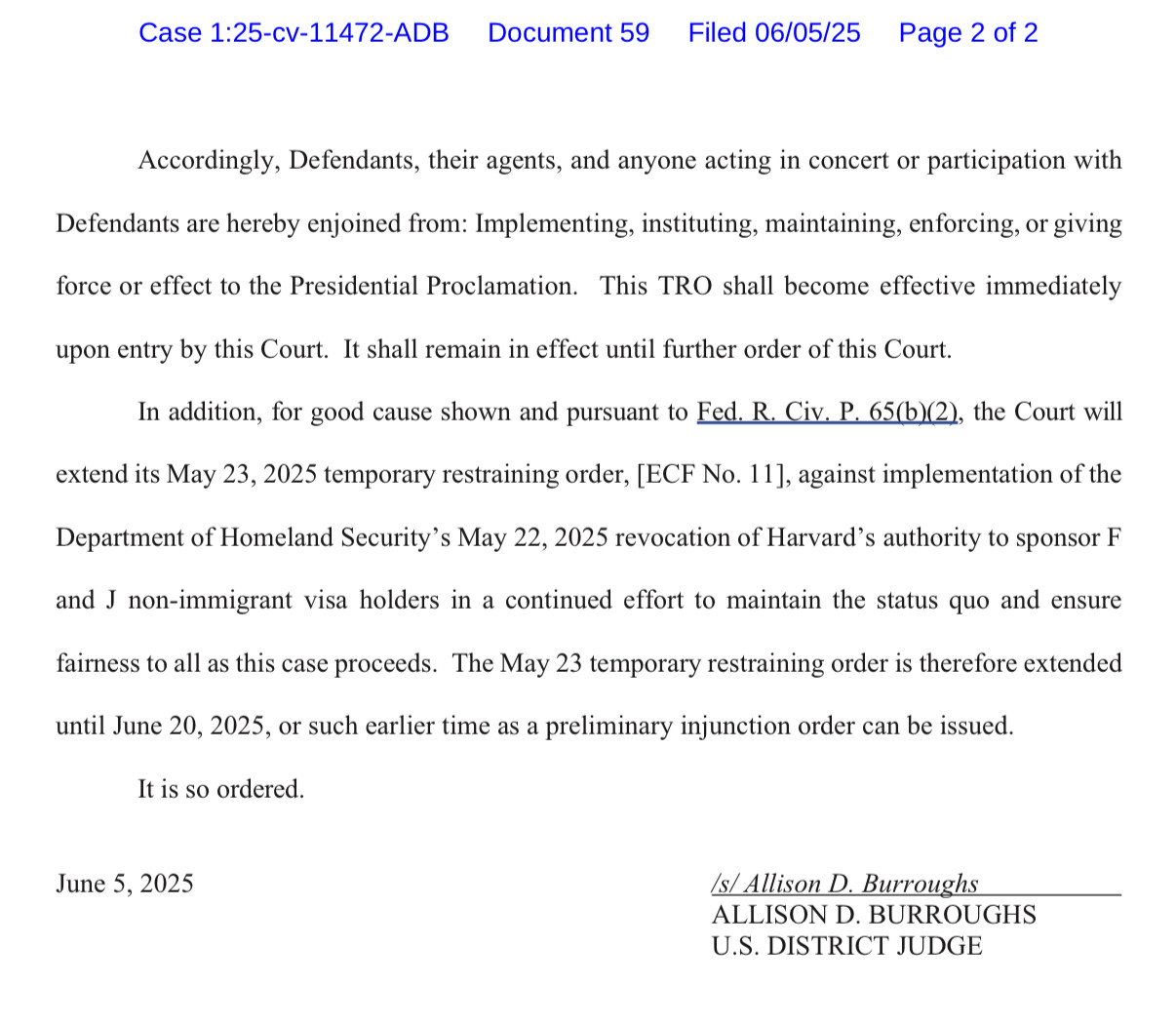 BREAKING: Judge Burroughs grants a temporary restraining order blocking Trumpâs effort to block foreign students from attending Harvard. storage.courtlistener.com/recap/gov.us...