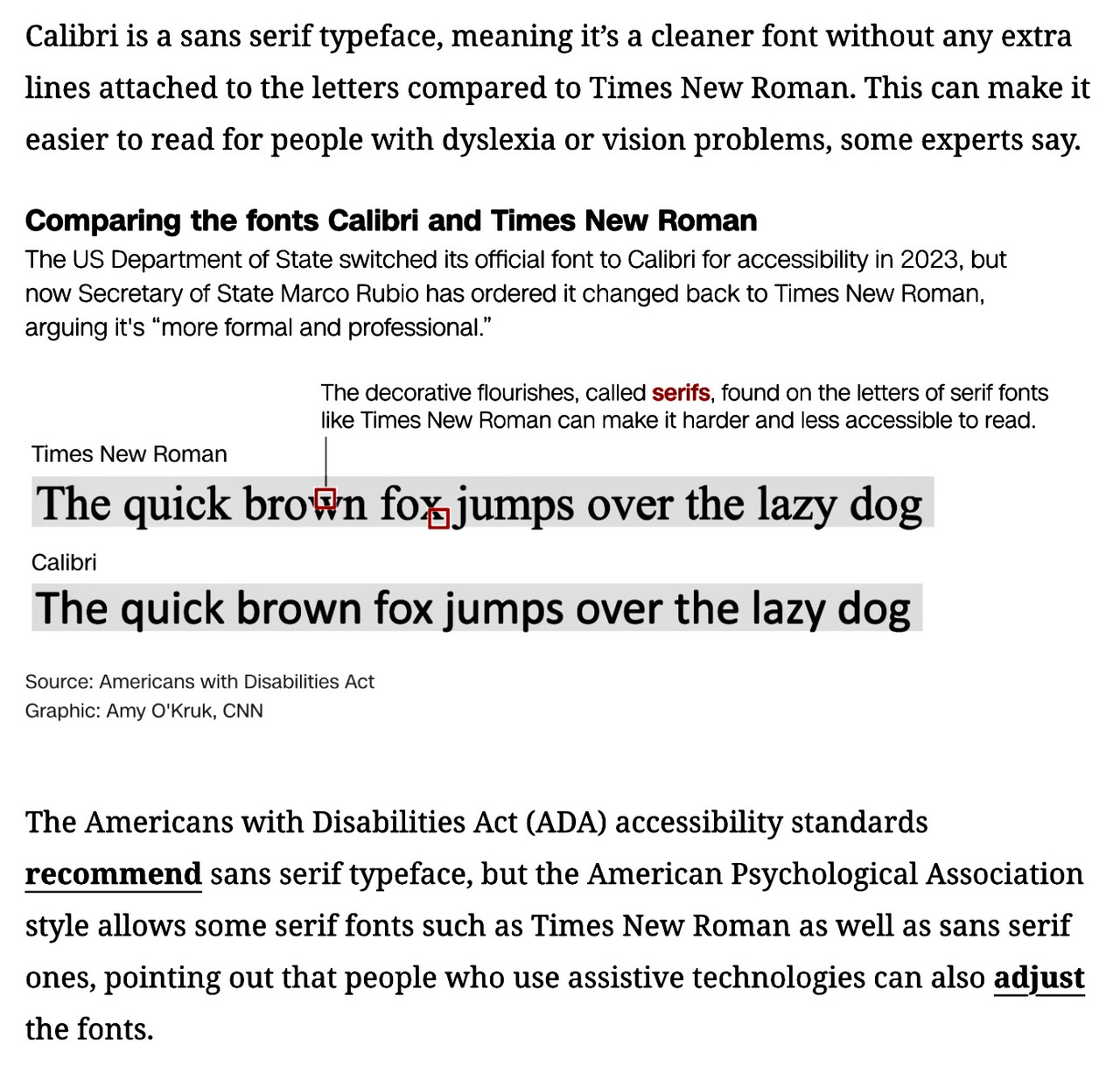 Rubio decided it was important to replace the sans serif Calibri font because it was part of a "wasteful DEIA program." While the DEI bogeyman is familiar to most of us, it turns out that if you add A to the acronym you can also include "Accessibility" in the woke target list. Watch out wheelchair ramps, MAGA is coming after you!