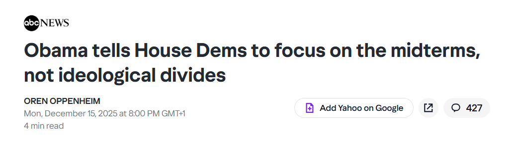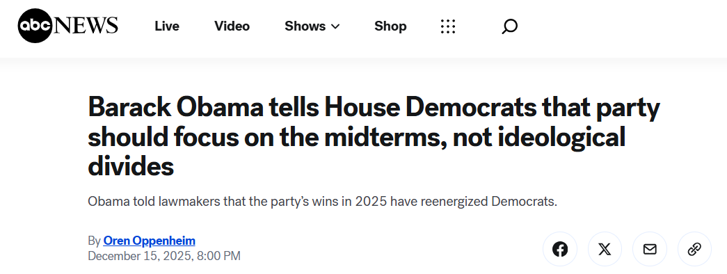 Obama told the lawmakers to "focus" on winning back the Republican-controlled House in the 2026 midterm elections, indicating that after that the party could work more through those ideological divisions.