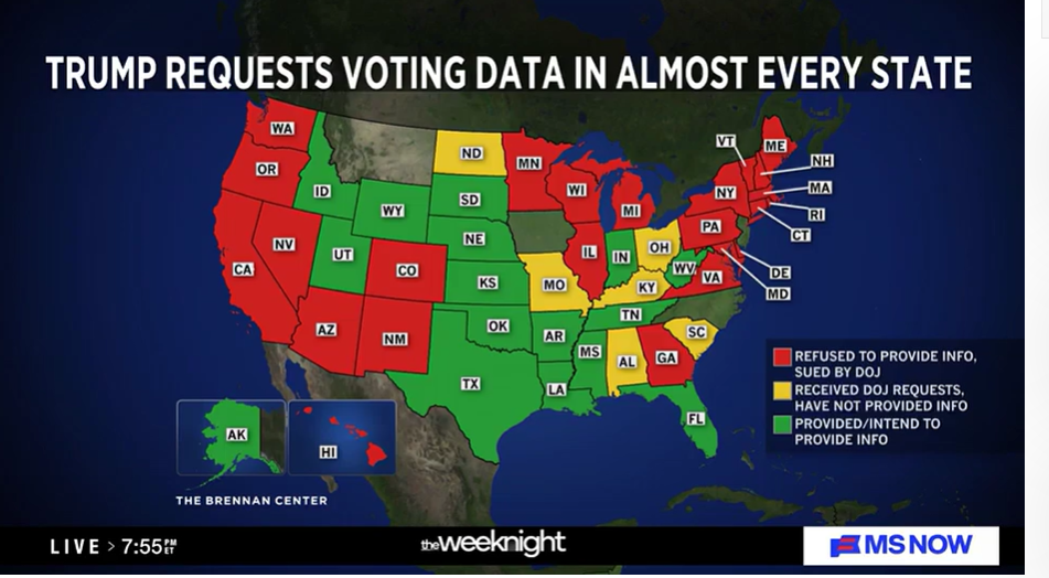 Related: Editorials & Other Articles, Issue Forums, Alliance Forums, Region ForumsMSNOW - map of the states involved w/ Trump's trying to get election data (rolls, SS numbers, drivers licence info, etc)