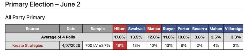 (2,994 posts)I'm thinking Steyer might be the best alternative... which would have been unfathomable to me four days ago when my daughter first heard the rumors. It just seems like Porter is not very popular, anymore, even among Democrats, and Steyer is the only other frontrunner. We need someone to break into the lead FAST with this stupid jungle primary. Maybe if the electeds get behind Porter? I feel it would be hard for them to land on Becerra, given his polling?