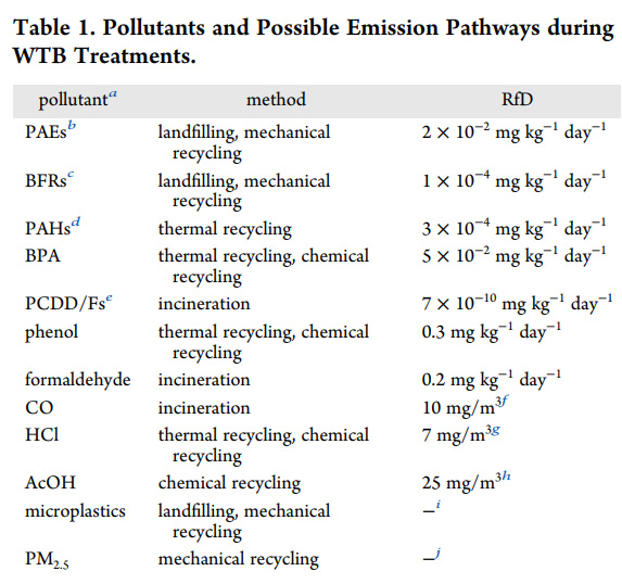 WTBs are primarily composite structures, comprising a box beam (spar cap and shear web) and an aerodynamic shell. The spar caps are solid fiber-reinforced polymer (FRP) laminates, whereas the shear webs and shell are typically FRP–core–FRP sandwich forms with polymer foam or balsa cores. Manufacturing these components still relies on catalysts, curing agents, flame retardants, and plasticizers. While functionally irreplaceable, these substances lock in pollutant risks that inevitably resurface during end-of-life treatments. In the absence of blade-specific regulation, such chemicals remain in service, particularly in older equipment containing phased-out compounds. This legacy of embedded chemicals complicates end-of-life management and amplifies disposal risks. Prior work shows that additives in FRP waste, including WTBs, can persist through recycling processes and pose long-term environmental hazards, (3) yet most assessments of WTB treatment options have not put these chemicals, and the secondary pollutants they can generate, at the center of the evaluation. (4) Instead, existing comparisons are typically framed around recovery yield, cost, or energy–climate metrics under tools like life cycle assessment (LCA) or technology readiness levels (TRLs). (5) Here we bring secondary pollution back into focus by summarizing the major pollutant classes associated with blade materials and linking them to the treatment routes where releases are most likely (Figure 1a). Current treatment strategies include landfilling, incineration, mechanical recycling, thermal recycling, and chemical recycling (Figure 1b). (6) Each pathway can generate hazardous pollutants if controls are inadequate, posing risks to both human health and ecosystems (Table 1). (4)...
