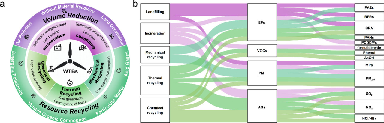 Figure 1. Schemes of WTB treatment methods. (a) Representative schemes of WTB treatment methods, grouped into volume reduction (landfilling and incineration, purple) and resource recycling (mechanical, thermal, and chemical recycling, green). Advantages and limitations of each method are indicated. (b) Pollutant emissions linked to each treatment method, categorized as emerging pollutants (EPs), volatile organic compounds (VOCs), particulate matter (PM), and acid gases (AGs). Abbreviations: PAEs, phthalate esters; BFRs, brominated flame retardants; BPA, bisphenol A; PAHs, polycyclic aromatic hydrocarbons; PCDD/Fs, polychlorinated dibenzo-p-dioxins and furans; AcOH, acetic acid; MPs, microplastics; PM2.5, fine particulate matter; SO2, sulfur dioxide; NOx, nitrogen oxides; HCl/HBr, hydrogen chloride/hydrogen bromide.