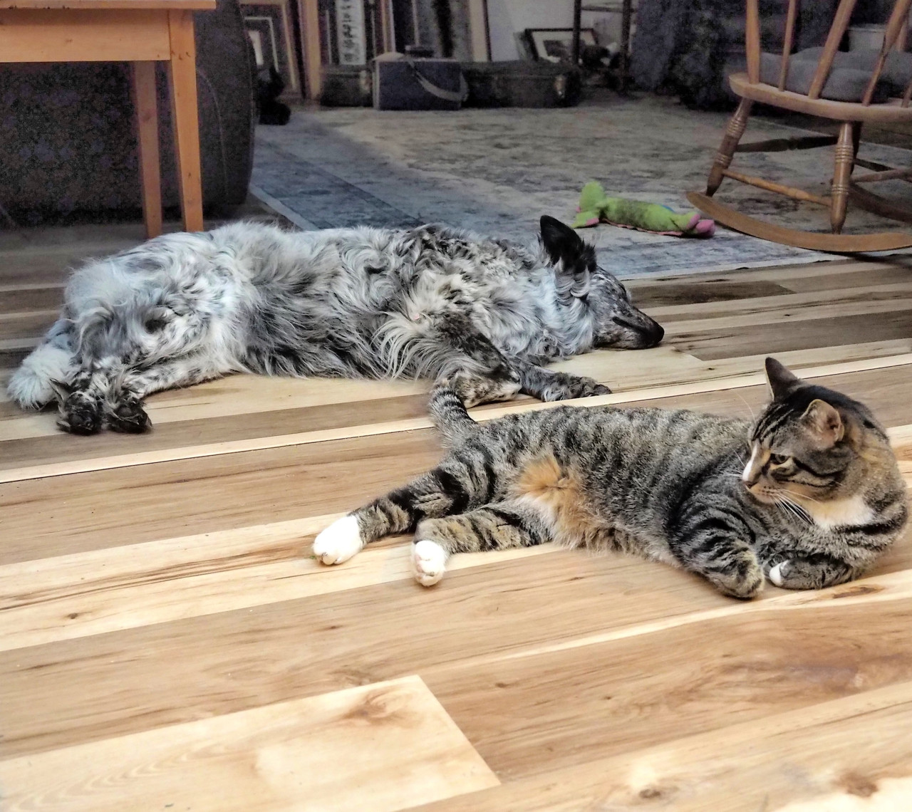 I have had that species combo staring down over my face in bed. Cute as can be but undtimely so. Yours are, of course, adorable. Your cat looks a lot like my Lilly, who came to live with us in July.