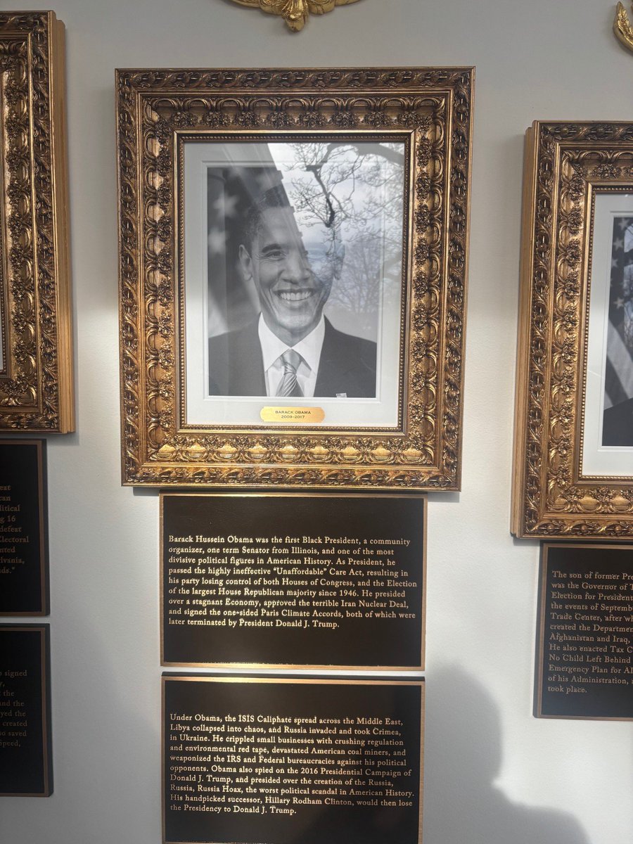 Barack Obama's plaque refers to "Barack Hussein Obama" and calls him "one of the most divisive political figures in American History." It goes on to say Obama passed "the highly ineffectual 'Unaffordable' Care Act," while also taking a shot on Obama's foreign policy with Iran.